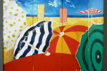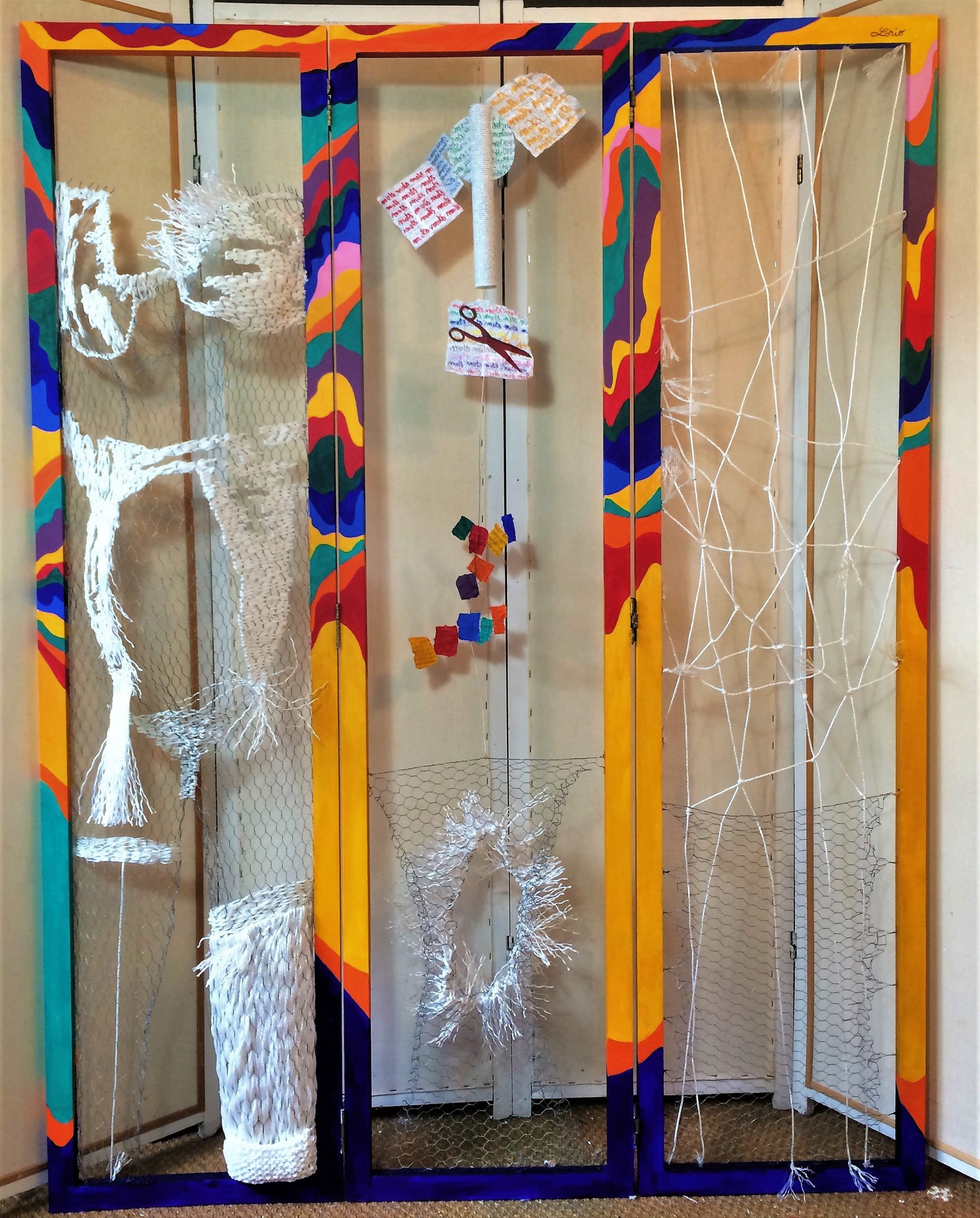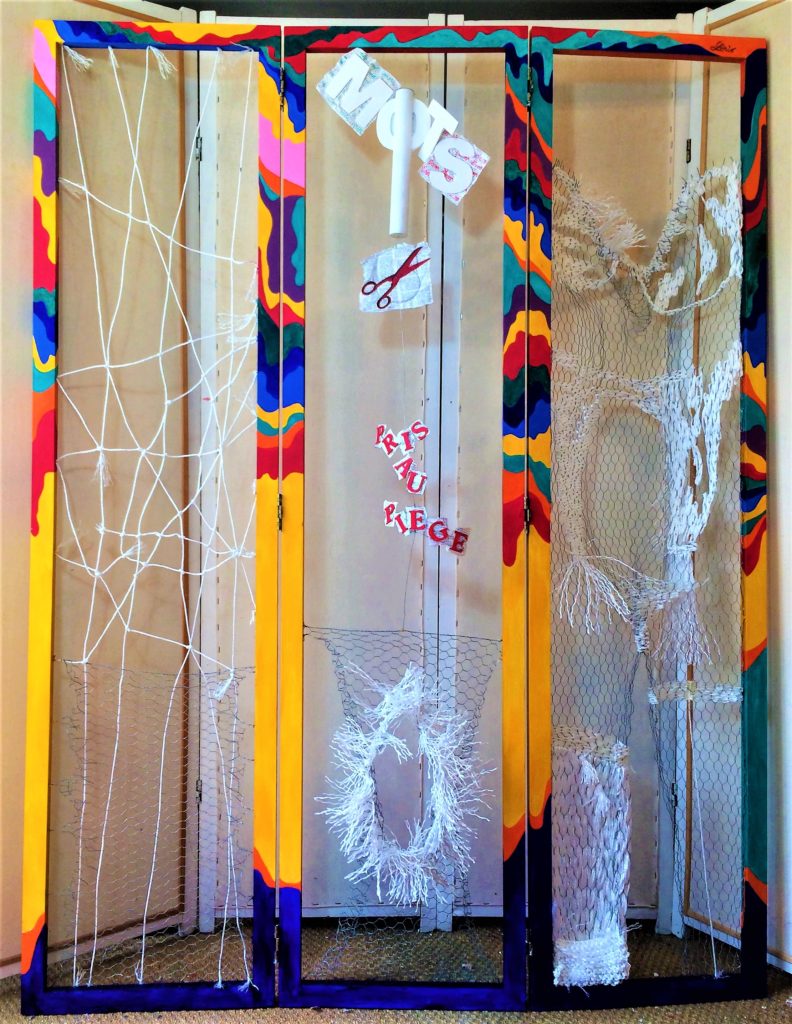 Grillage, ficelle, papier, carton, collage, peinture acrylique