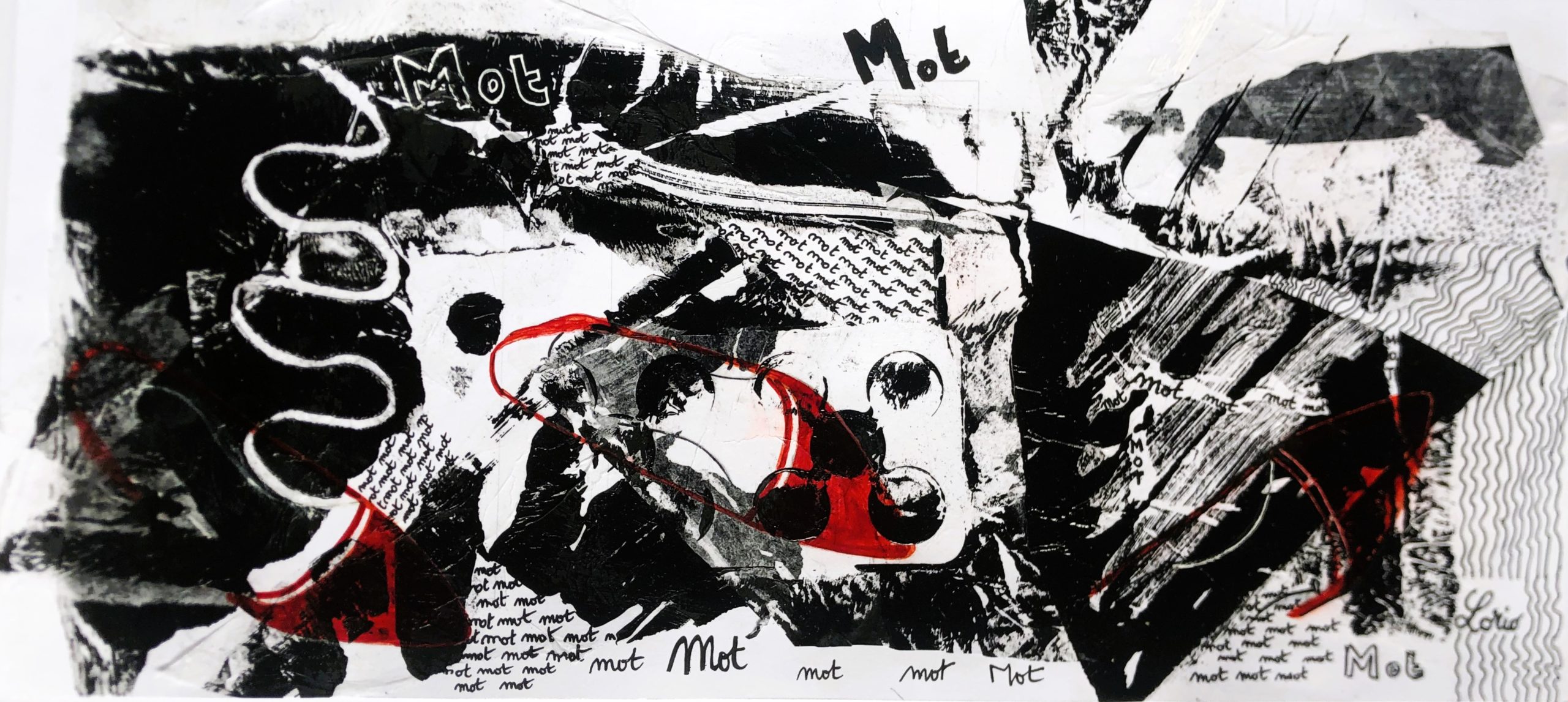 Dessin encre de chine collage monotype 25 cm x 50 cm Série Les mots