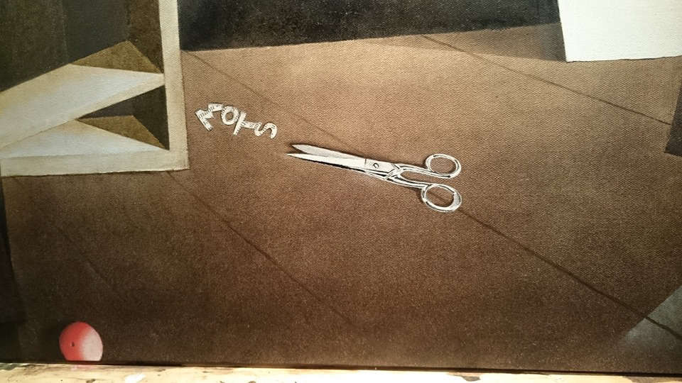 par excellence, et ce ciseau se situe juste en dessous du tableau de la femme nue. La forme même du ciseau évoque le phallus muni de ses testicules, comme tombés du tableau, tombés du corps de la femme.