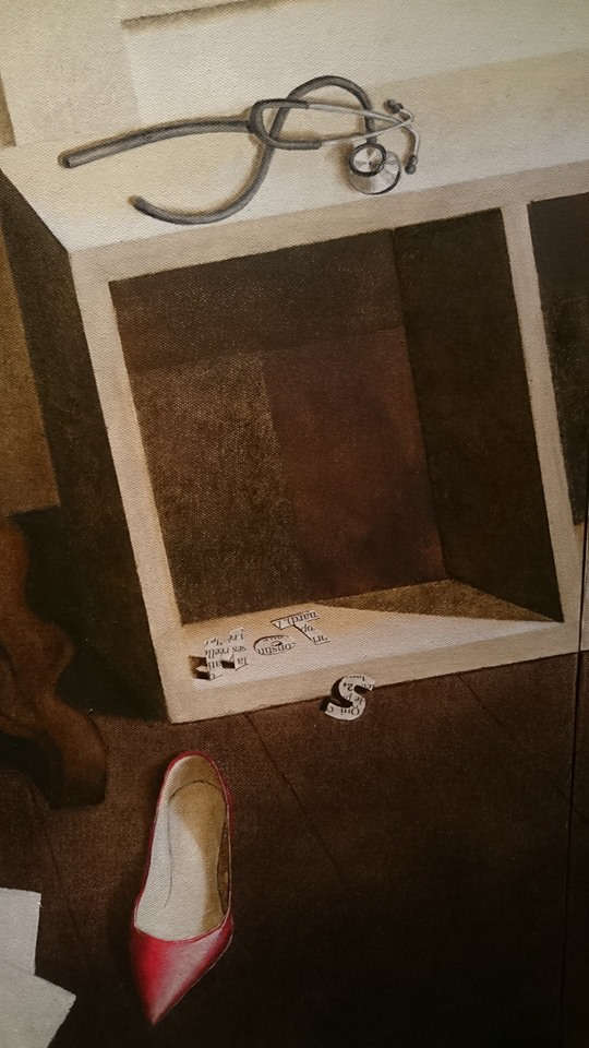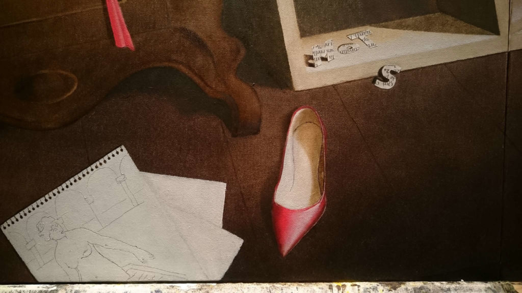 – Le tissu rouge pendant d’un tiroir de l’armoire à glace rappelle le phallus coupé. Et pourquoi un miroir, si ce n’est parce que c’est celui dans lequel elle se regarde comme un homme qui s’en va. Il reste la consolation du derrière, qui est semblable chez tous les humains. En redondance, l’escarpin rouge dont le talon rajoute à la femme les centimètres dont elle se pense privée, tandis que la couleur évoque à la fois la montée du désir et la blessure fondamentale.