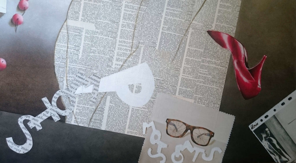 Les mots à trouver sont eux aussi découpés et de surcroit découpés dans un papier déjà recouvert de mots. C’est une sorte de cartographie de l’inconscient qui nous est proposée là, puisque ce refuge des pensées refoulées se présente comme un palimpseste de souvenirs auxquels le sujet fait appel pour compenser l’absence de mots autour de la question de la différence des sexes. Donc, le sexe féminin, caché pour les enfants, ne peut se présenter à leurs yeux autrement que comme le résultat d’une