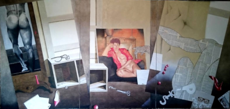 Un croquis de torse d’homme semble être tombé là avec ce poignet détaché, négligemment appuyé contre le tableau de la femme. Ce dessin, signé Lorio comme celui de la femme, à terre de l’autre côté du triptyque, coupe la tête et le ventre de l’homme.