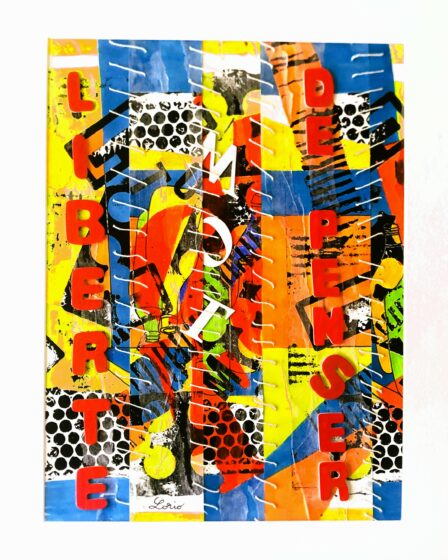 Les mots Paravent composé de 3 feuilles Grillage, ficelle, papier, carton, collage, peinture acrylique Hauteur 160 cm largeur 40 cm x 3
