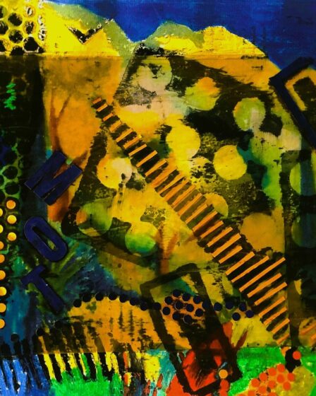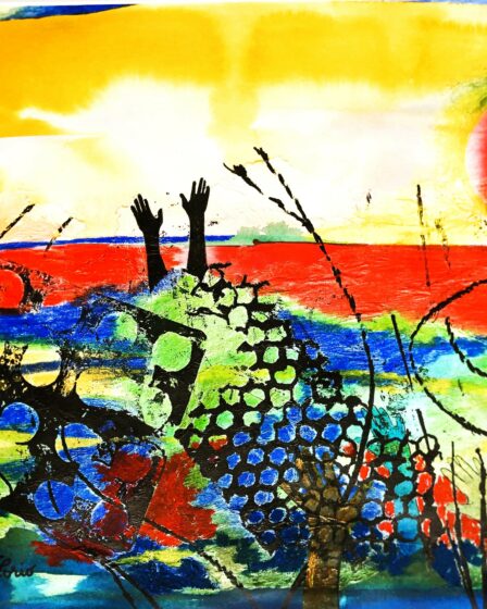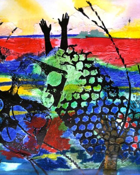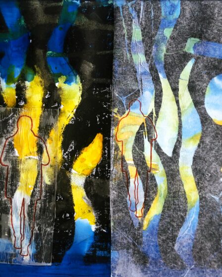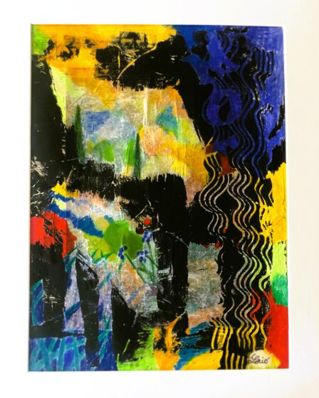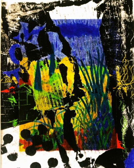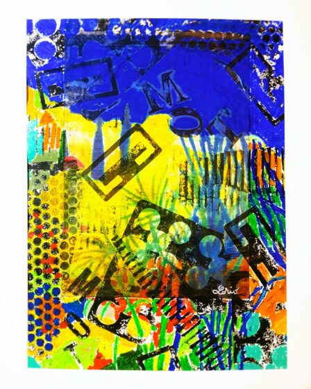 A contre-courant Dessin Technique mixte: monotype sur papier de soie marouflé sur encre colorée, crayons de couleurs, collagraphie, encre noire 50 cm x 70 cm